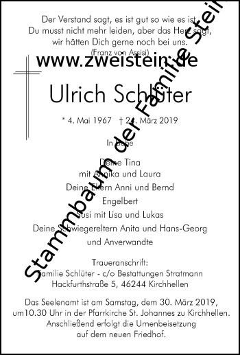 | Medienobjekt | Ulrich-Schlüter-Traueranzeige-68d41e82-065e-4db4-97c1-9bda52fdbf88.jpg Format: image/jpeg Bildmaße: 350 × 517 Pixel Dateigröße: 38 kB Typ: Foto |