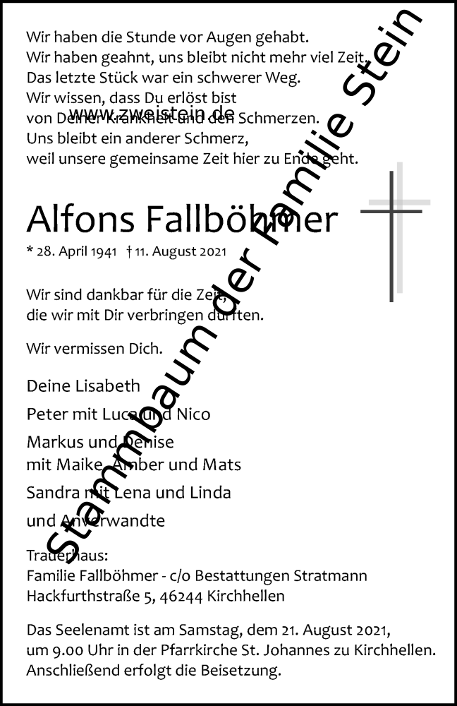 Traueranzeige Alfons Fallböhmer