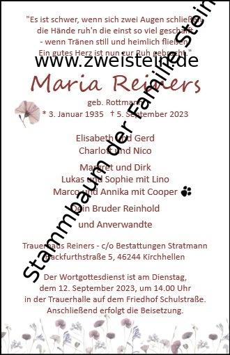 | Medienobjekt | Maria Reiners Traueranzeige.jpg Format: image/jpeg Bildmaße: 330 × 510 Pixel Dateigröße: 58 kB Typ: Foto |